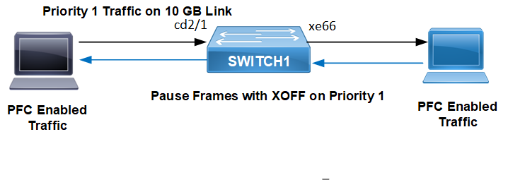 The following topology shows PFC pause frame monitoring on the ingress and egress interfaces of Switch 1.