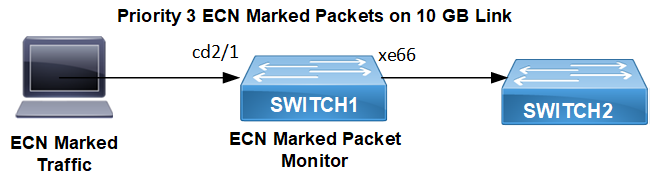 The following topology shows ECN Marked packets monitoring on the ingress and egress interfaces of Switch 1.
