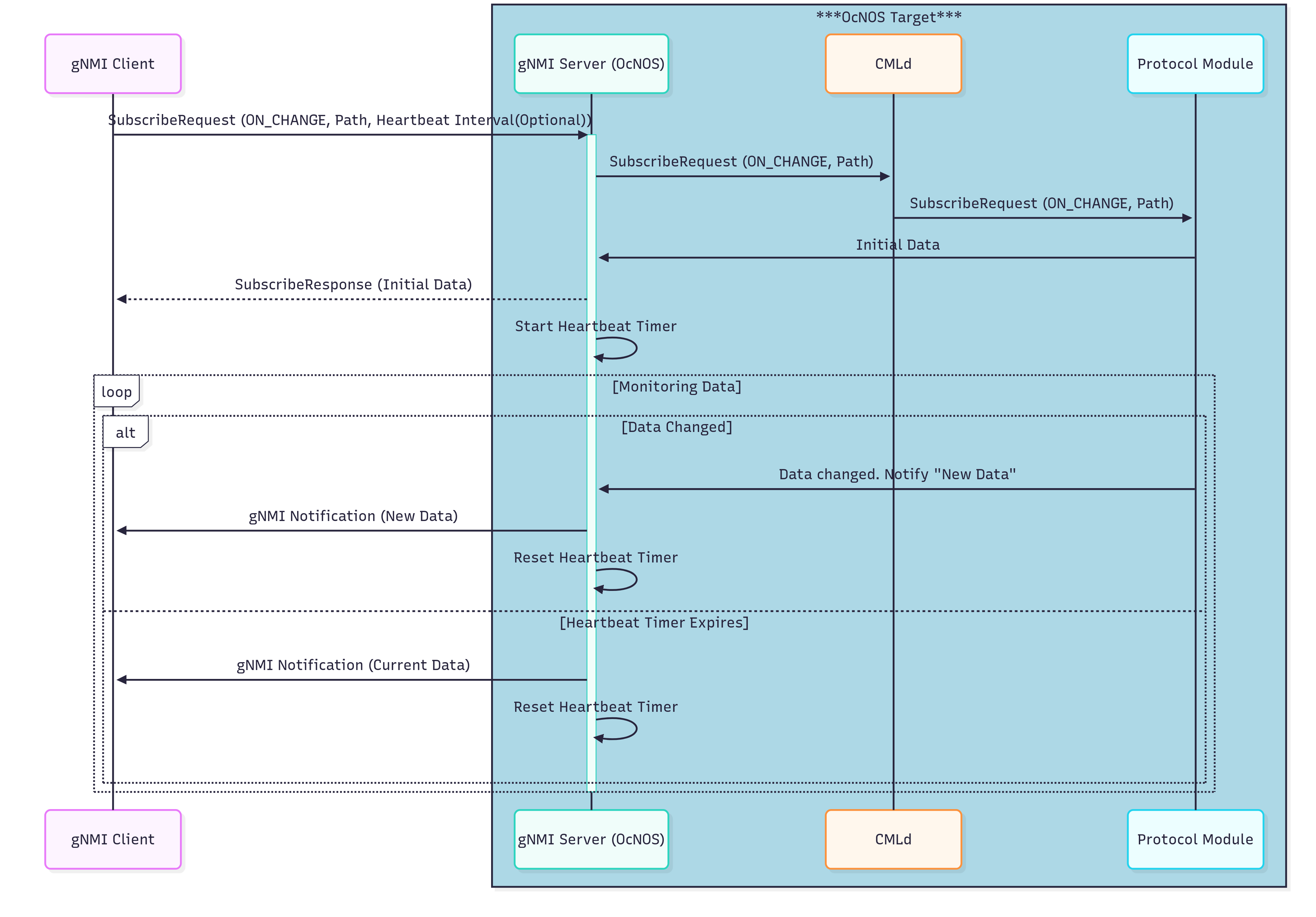 The gNMI client sends a Subscribe Request message to the OcNOS gNMI Server with mode set to on-change, specifying the sensor path(s) and an optional heartbeat interval.