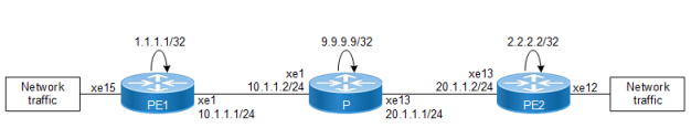 | 1. | Configure the IP address and OSPF for the PE1, P (Provider), and PE2 routers. |