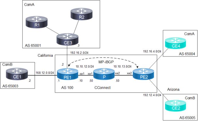 In this example, the CConnect MPLS-VPN backbone has two customers — ComA and ComB. Both customers have sites in California and Arizona. The following topology shows BGP4 address assignment between PE and CE routers. The steps that follow provision a customer VPN service across the MPLS-VPN backbone.